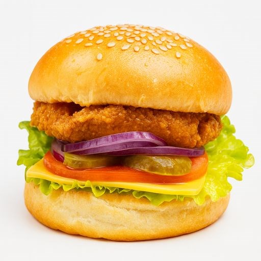 Булочка, котлета "Чикен", соус для курицы, помидор, сыр плавленный, лист салата, лук красный репчатый, огурец