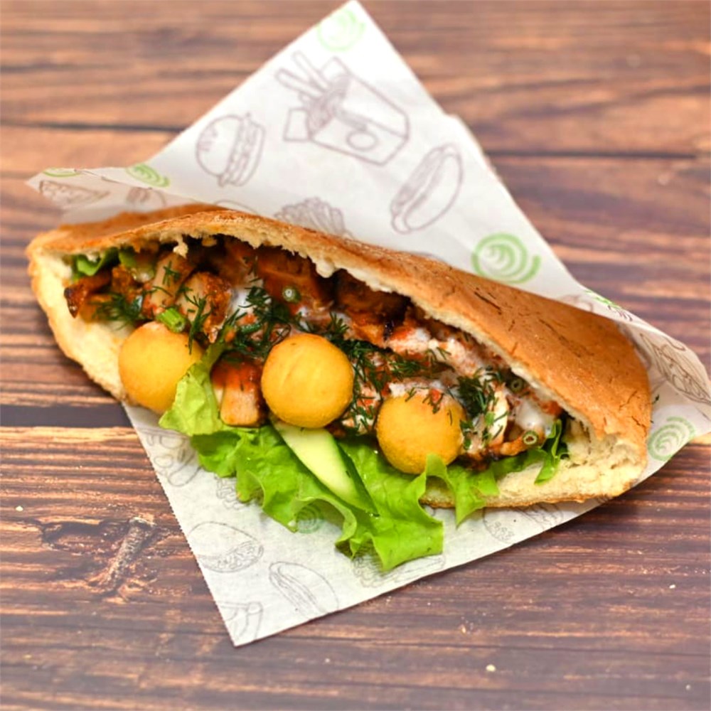 Лепешка, капуста пекинская, помидор, огурцы маринованные, говядина, соус чесночный, соус барбекю, лук красный репчатый, зелень, лист салата, картофельные шарики