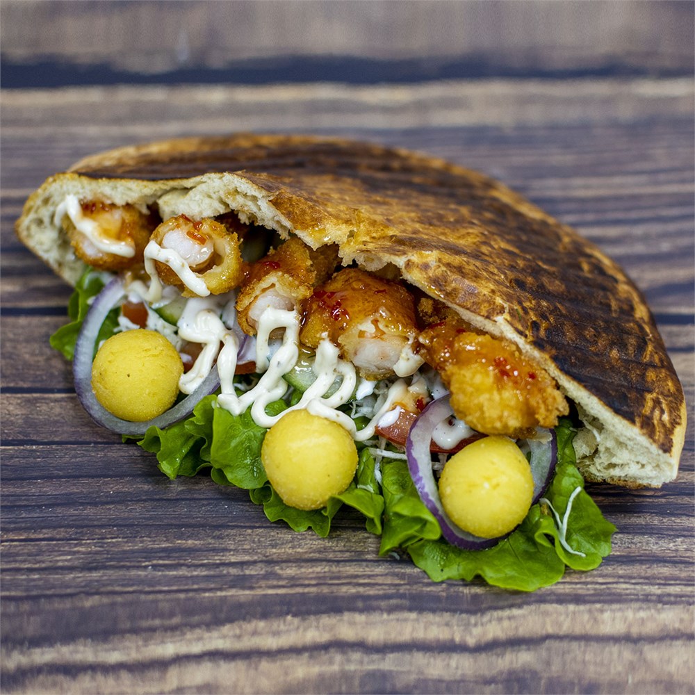 Лепешка, капуста пекинская, помидор, огурцы, креветки, соус свит чили, соус цезарь, лук красный репчатый, зелень, лист салата, картофельные шарики