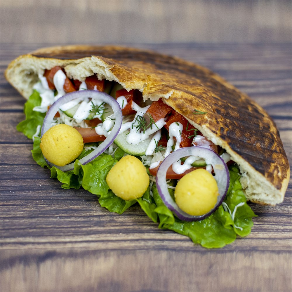 Лепешка, капуста пекинская, помидор, огурцы , нерка х/к, соус чесночный, сыр сливочный, лук красный репчатый, зелень, лист салата, картофельные шарики