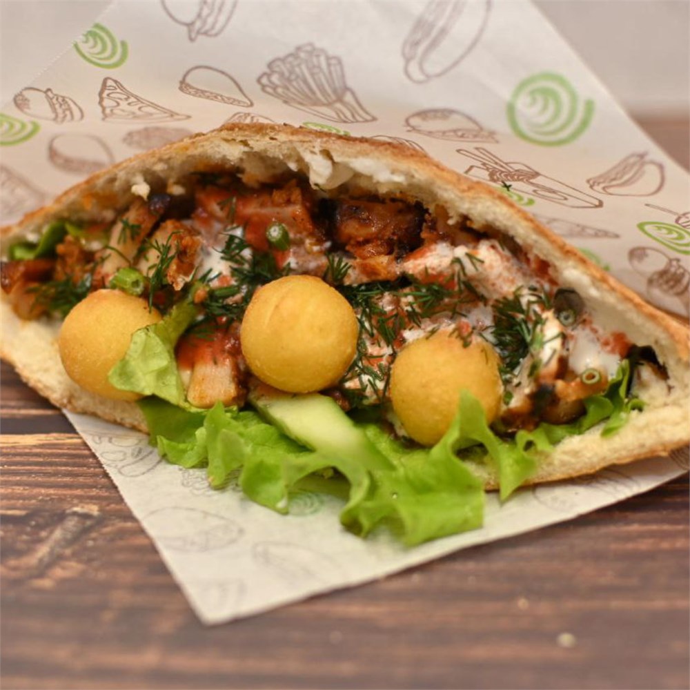 Лепешка, капуста пекинская, помидор, огурец, свинина шея, соус чесночный, лук красный репчатый, зелень, лист салата, картофельные шарики