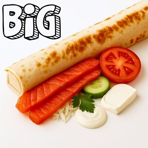 Лаваш, нерка х/к, капуста пекинская, помидор, огурец, соус чесночный, зелень, сыр сливочный