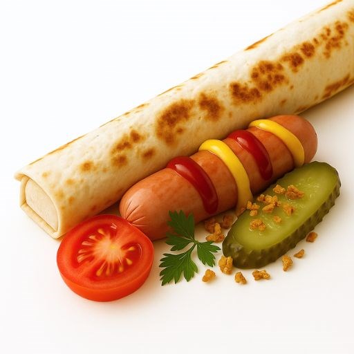 Лаваш, капуста пекинская, сосиска невская, помидор, огурец маринованный, кетчуп, соус горчичный, зелень, лук жаренный