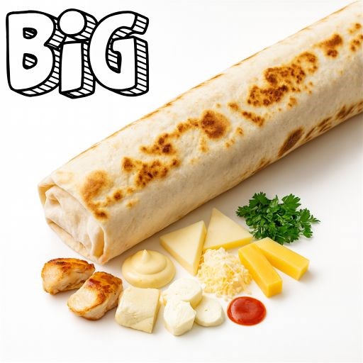 Лаваш, капуста пекинская, филе куриное с бедра, помидор, огурец, соус сырный, сыр моцарелла, сыр сливочный, сыр пармезан, сыр чеддер, зелень
