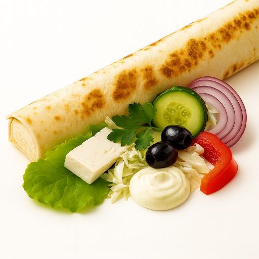 Лаваш, лист салата, сыр брынза, капуста пекинская, огурец, соус чесночный, маслины, зелень, перец болгарский