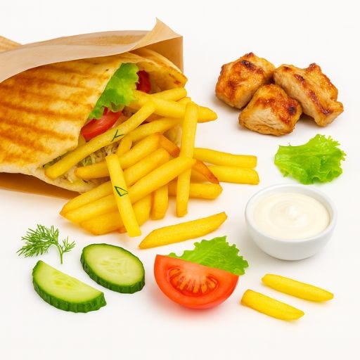 Капуста пекинская, филе куриное с бедра, Соус фирменный, помидоры, огурцы, зелень, лист салата, картофель фри