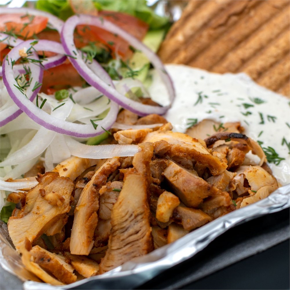 Лепешка, капуста пекинская, помидор, огурцы, филе куриное с бедра, соус чесночный, лук красный репчатый, зелень, лист салата, картофельные шарики