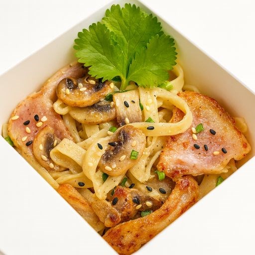 Филе куриное с бедра, бекон, лапша удон, шампиньоны, сливки 22%, сыр пармезан, кунжут, перец черный, соль, кинза